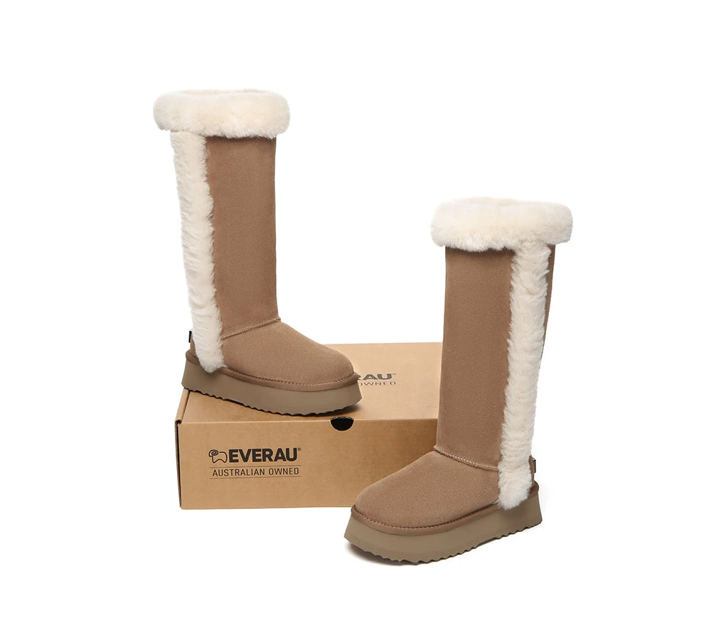 The EVERAU Kazzi Tall Platform Boots add a new meaning to style with its elevated design. Crafted with a water-resistant coating to suit outdoor wear and luxurious sheepskin to provide ultra warmth during cooler days, the boots are the perfect choice for your winter wardrobe. The tall boot features strong sculptures and a shoe tab for easy pull-on, while the on-trend platform and wool decor give the boot an elevated look.